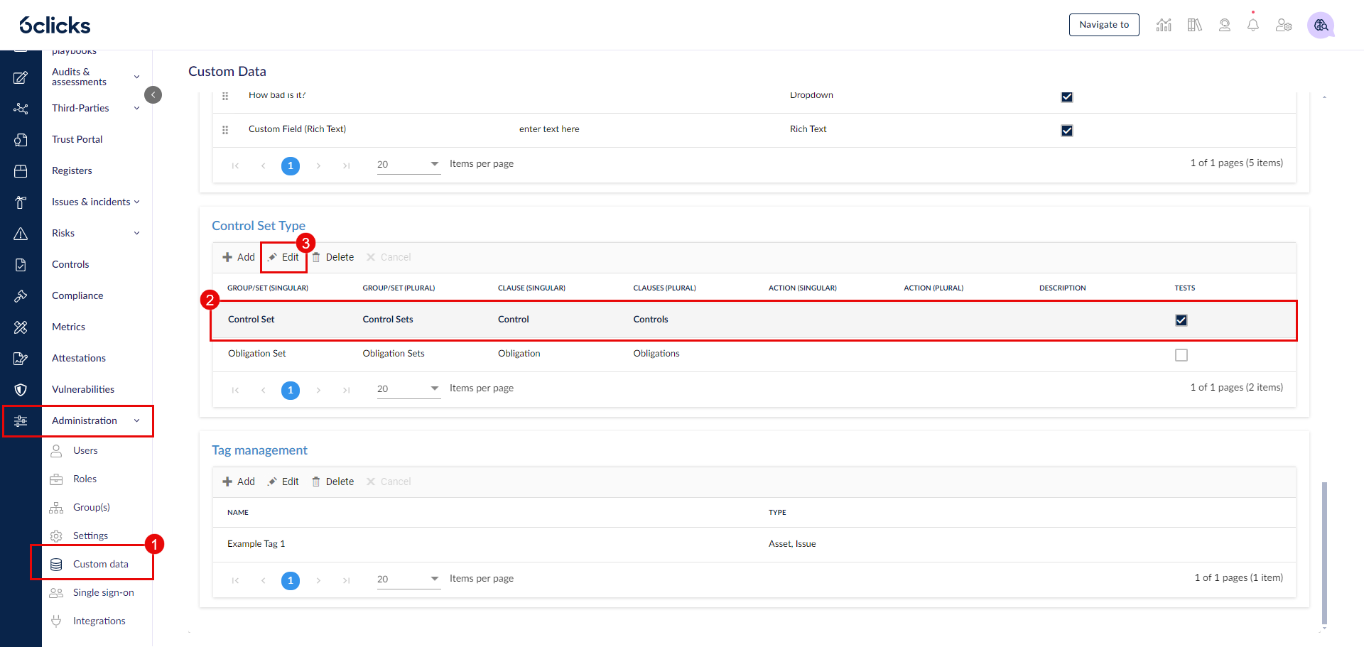 To use tests for a control set type, make sure tests are enabled for it. To enable using tests for a certain control type, go to Administration > Custom data (1) and find the Control Set Type table.