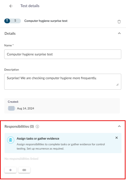 Responsibilities linked to tests are separate from responsibilities linked to controls. This is because a test may be applicable to multiple controls, but a responsibility that is applicable to one of those controls may not be applicable to the other controls just because these controls use the same test.