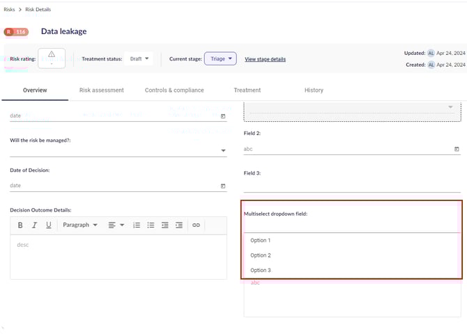 The custom field has now been successfully created and available in all risks.