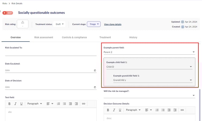 Risk Admins can manage and edit custom fields even when those fields are used as entry or exit requirements within a Risk workflow. The application supports updating custom fields regardless of their use in workflow criteria and automatically handles any related cascading changes. This ensures that workflows remain consistent and functional without requiring manual reconfiguration when changes are made to custom fields.