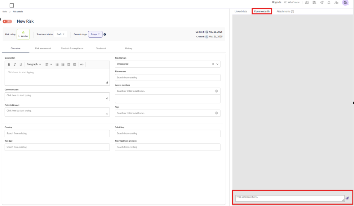 Users with the appropriate permissions to access the Risk module, or who have been assigned to a specific risk, are able to view and add comments. Comments can be added by navigating to the relevant risk record. In the right-hand side panel, the Comments tab will be displayed alongside Linked Data and Attachments. From this tab, users can read existing comments and submit new ones.