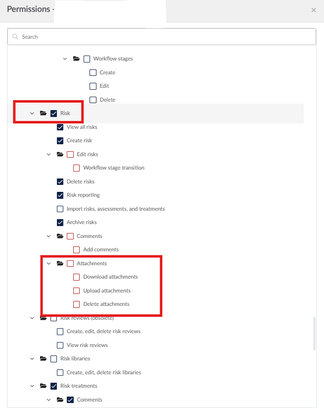 Permissions governing attachment visibility, upload rights, and download access can be configured within Role Permissions or User Permissions, as illustrated below.