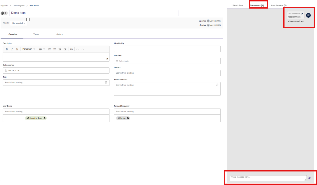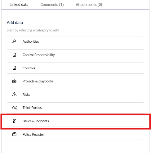 In the side panel menu to the right, you can link data to this record in the Linked data tab, such as issues, assets, risks, or records from other custom registers, or attach documents to the record in the Attachments tab.