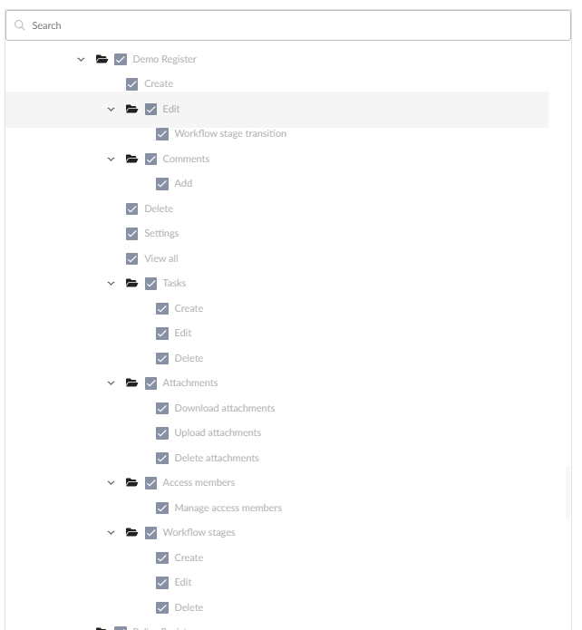 The Attachments permission controls a user’s ability to manage register attachments. This includes the ability to download, upload, and delete attachments. If all three permissions are enabled, the user will have full attachment management capabilities. If only specific permissions are granted, the user’s actions will be limited to those selected options.