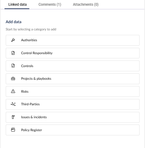 - + Add data - click here to add another type of data, such as assessments, controls, risks, a different custom register, etc.