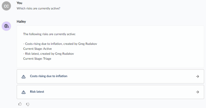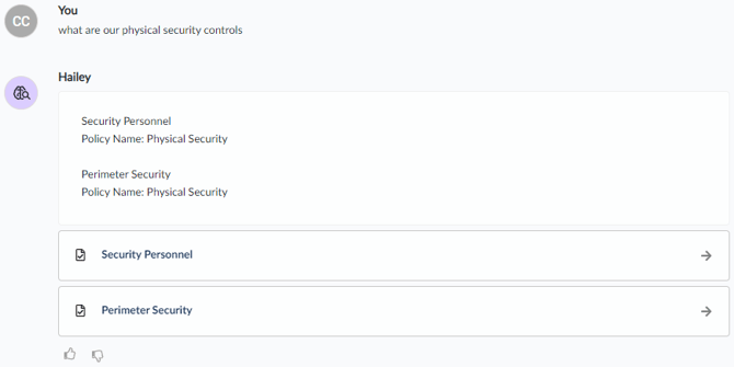Hailey is an expert assistant, always available to help you get answers to your GRC questions and gain insights into your data easily. You can ask Hailey anything in natural language, and Hailey will find the information you need.