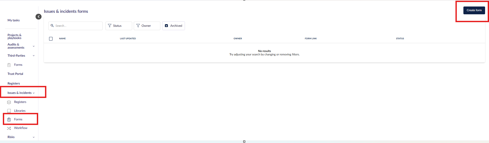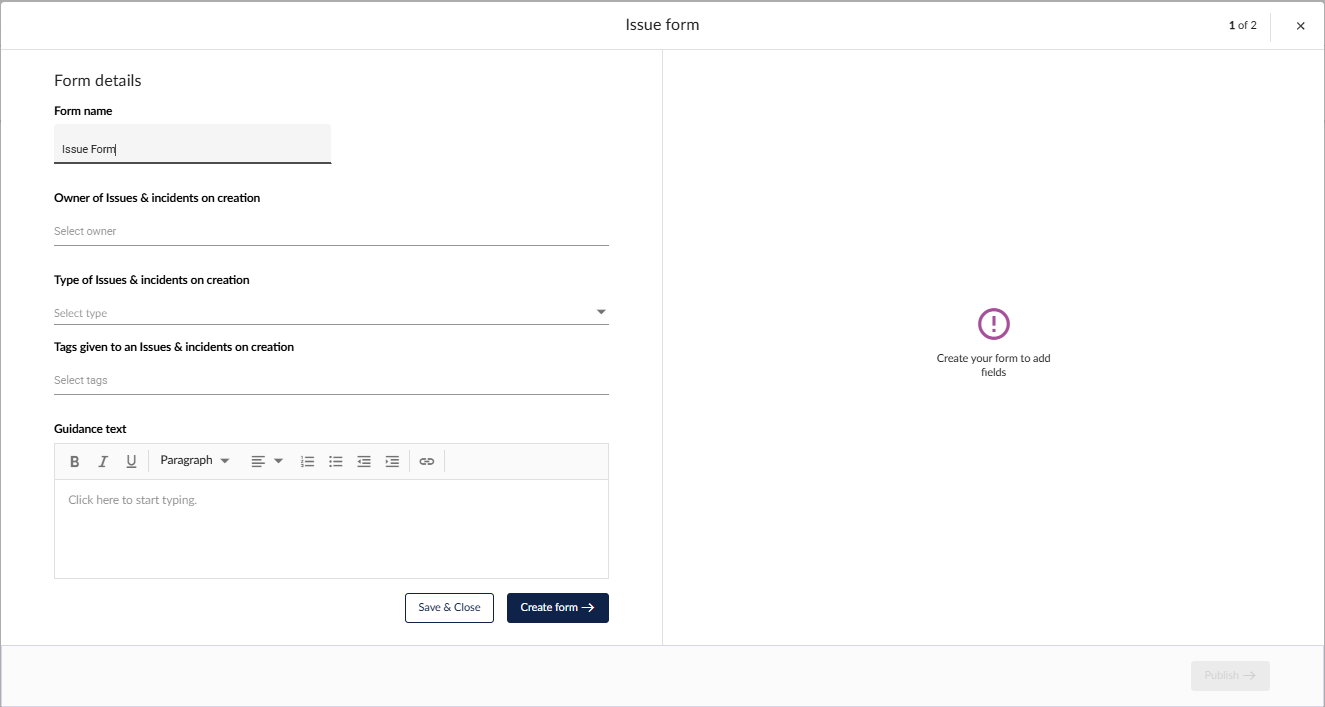 Go to Issues & Incidents > Forms and click Create form at the top right of the page.
