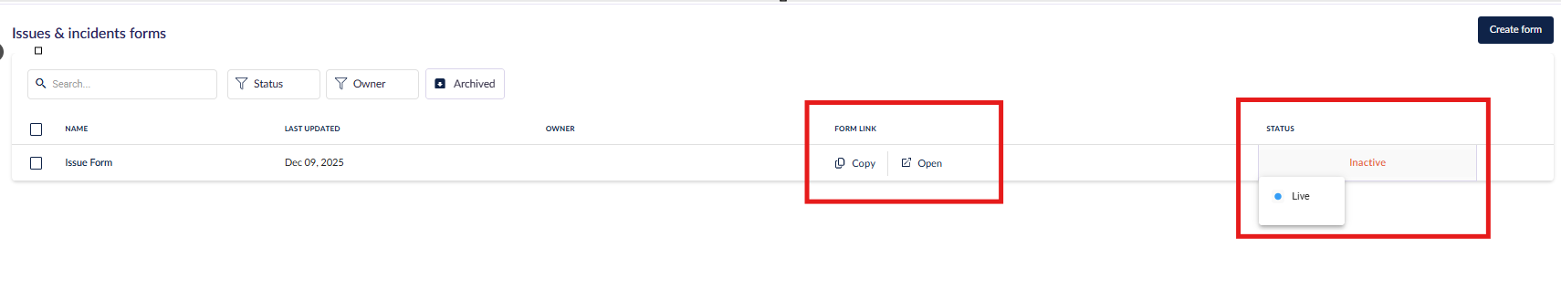 The live form will now appear in the Issue & Incident Forms list. From this view, you can use the Copy icon to copy the form’s URL, allowing you to paste it into a new browser tab or share the link internally. You can also open the form directly in a new tab by selecting Open.