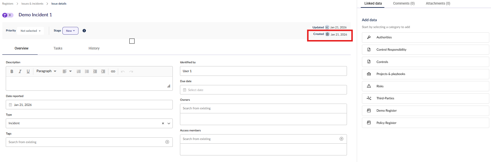 - Tags given to an issue or incident on creation - tags can be used to categorize issues/incidents; learn more about tag management here. If you are already using tags elsewhere, they will show up as a dropdown list here for you to add. If you have the correct permissions, you can create a new tag by typing in the new tag and pressing Enter.