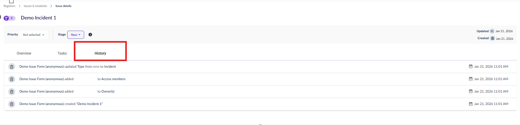 You can edit any details entered through an issue form, provided you have the appropriate view and edit permissions. Issues and incidents created via form submission are identifiable in the Priority Banner by a form icon displayed alongside the created date, indicating that the item originated from a form.