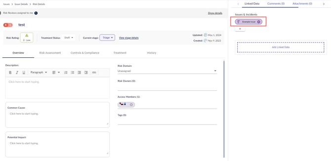 See all the risks linked to the issue by navigating to the Linked Data tab under the Risks column. Unlink a risk from here by clicking the x icon next to it.