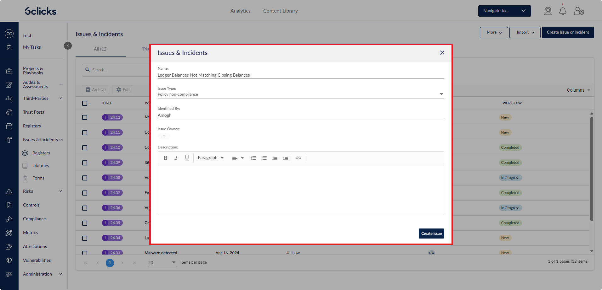 スタンドアロンレコードを作成するには、問題 & インシデント > 台帳 を選択します。これにより、組織内で記録された問題とインシデントの一覧が表示される問題台帳テーブルが開きます。