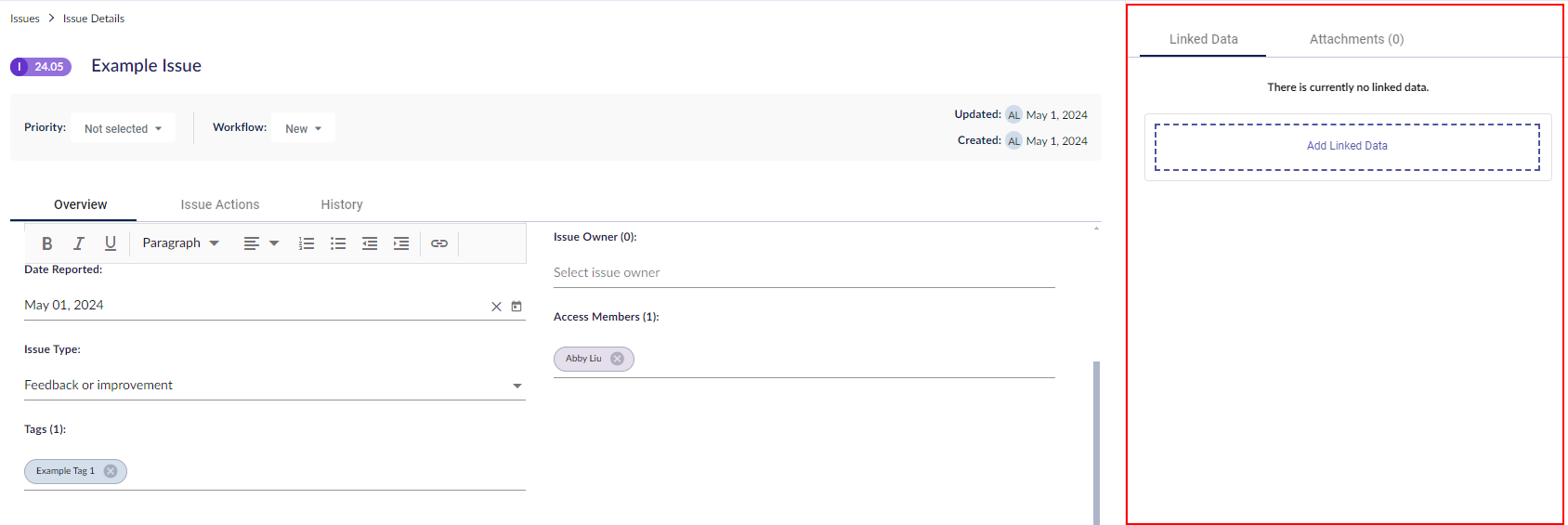 問題詳細モーダルには、3つのタブがあります: 概要、問題アクション、および 履歴。