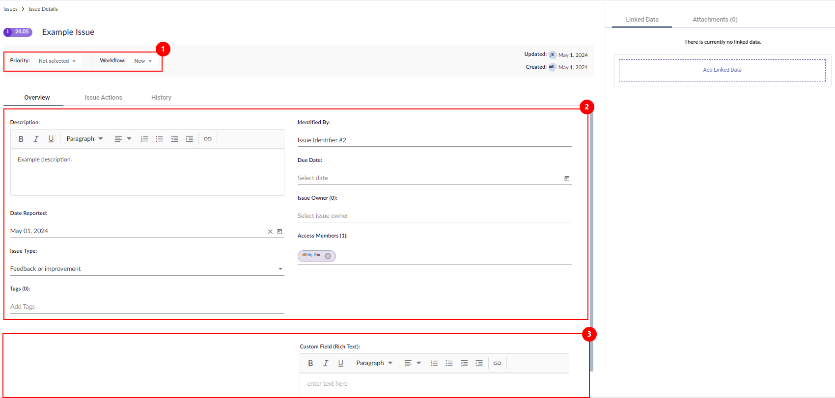 上から下に、概要タブでは、問題の詳細(例:優先度レベルとワークフロー段階 (1))、デフォルトフィールド (2)、および任意のカスタムフィールド (3) が説明されています。