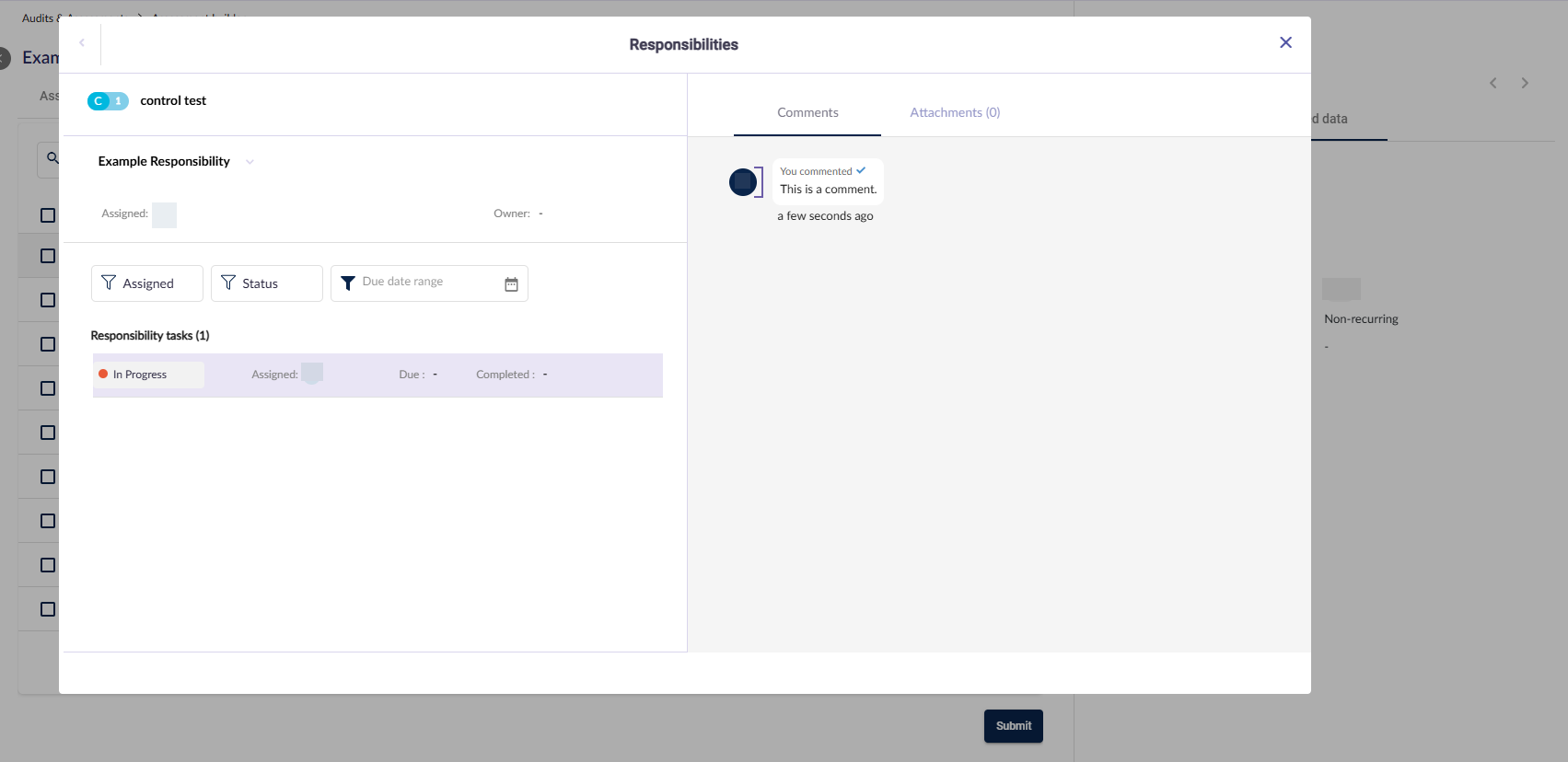 回答者が迅速にコントロール責任タスクの状況を確認し、コントロールの有効性を証明できるよう、RBA を離れることなく、責任および関連する責任タスクを表示できます。