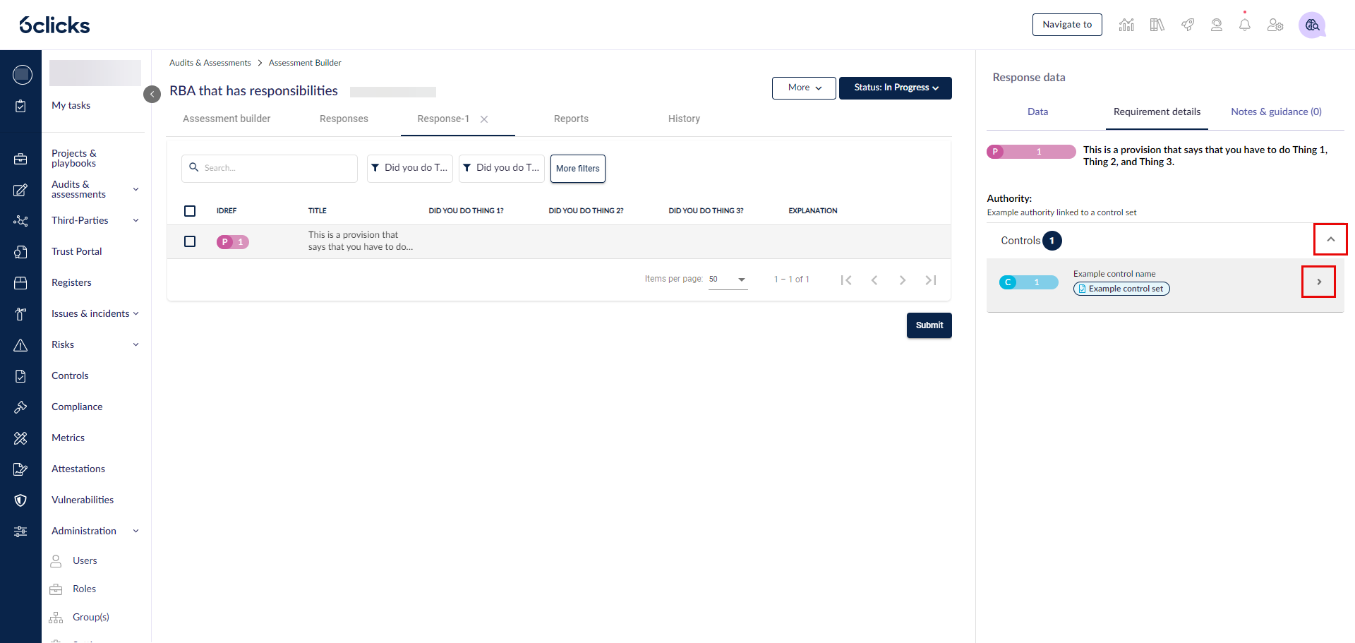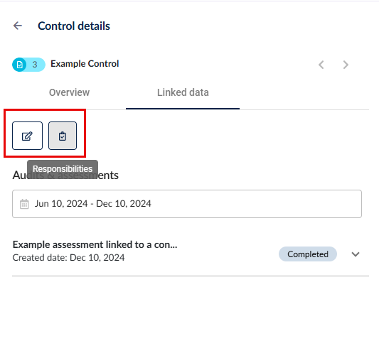 もし RBA が権限に基づいている場合は、「コントロール」セクションのドロップダウンをクリックすることで、その紐付けられたコントロールが表示されます。そして、コントロールをクリックすると、カスタムフィールドや責任(ある場合)の詳細が表示されます。