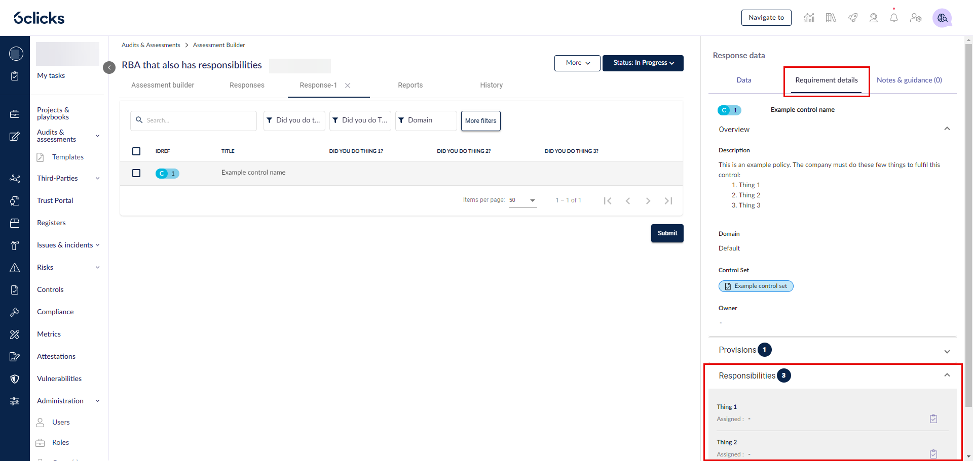 この例では、「Example control set」または「Example authority linked to a control set」に基づいて RBA を作成すると、RBA 内で Thing 1、Thing 2、および Thing 3 の責任を確認できます。