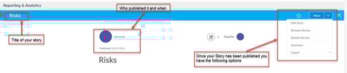 One you are happy with your Story and have clicked on Publish you then get an overview of your Story with all the details such as the Title of your Story, the person who published it and the date it was published and much more under the More option