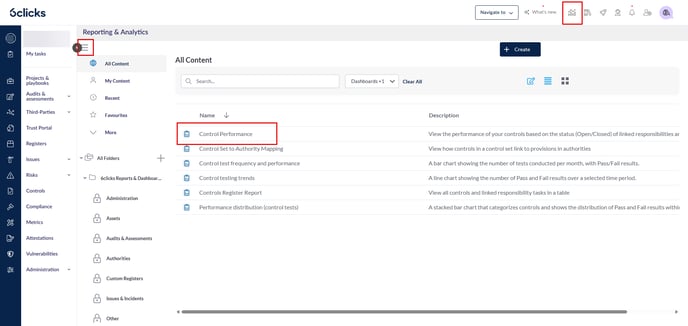 Head to the Reporting & Analytics module, open the hamburger menu using the 3-line icon in the top left and select Browse. Then search for the report called Control Performance. You can find it using the search bar or by heading to its folder on the left by going to All Folders > 6clicks Reports & Dashboards > Policies & Control sets.