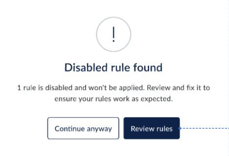 The message simply lets you know that some rules are turned off and encourages you to review them before continuing. It avoids technical language and focuses on helping you make an informed choice.
