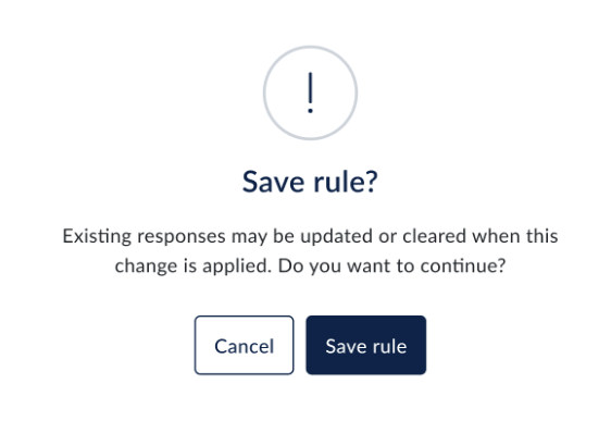 When you create, update, or delete rules within an assessment, you may see validation or warning messages before saving your changes. These messages are designed to help you understand how your updates could affect existing responses.