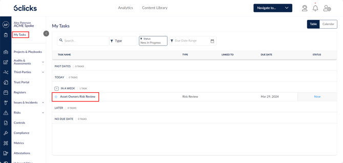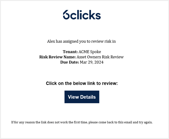 As a Risk Owner, you can access an assigned Review using the View Details link in the email notification or via the My Tasks page.