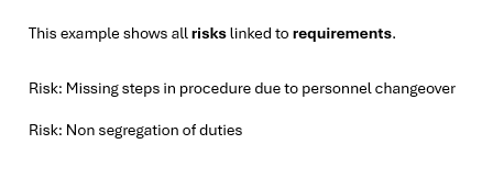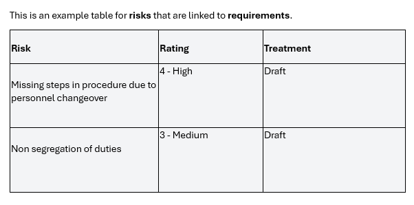 This is an example table for risks that are linked to requirements. It will loop through all the risks that are linked.