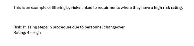 This is an example of filtering by risks linked to requirments where they have a high risk rating.