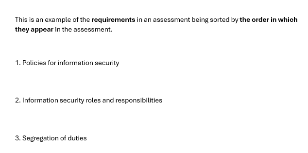 This is an example of the requirements in an assessment being sorted by the order in which they appear in the assessment.