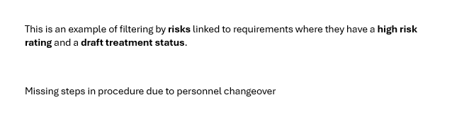 This is an example of filtering by risks linked to requirements where they have a high risk rating and a draft treatment status.