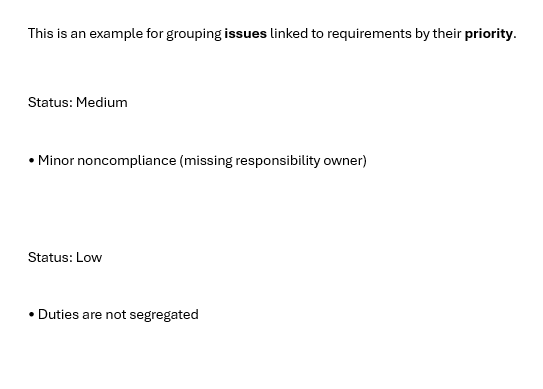 You can group records by a selected field. Grouped data appears as distinct sections in the generated report. Grouping can be applied to linked data such as risks, issues, and other registers.