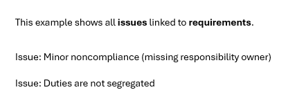 {#Assessment.Requirements | collect:'Issues&incidents'}