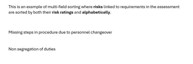 This is an example of multi-field sorting where risks linked to requirements in the assessment are sorted by both their risk ratings and alphabetically.