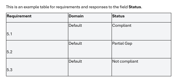 This is an example table for requirements and responses to the field Status. If your RBA has 30 requirements, it will loop for 30 rows in the final report.