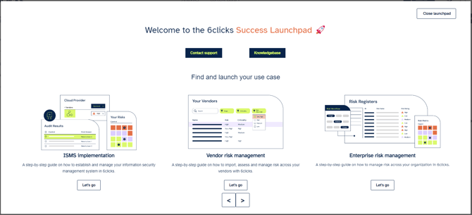 If you don't see what you need in the Success Launchpad, we may have a Knowledge Base article on the topic. You can always reach out to your 6clicks representative or our support team.